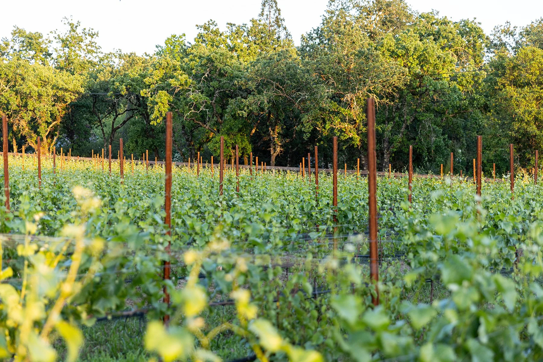 Vineyard rows with lush green grapevines and wooden posts, surrounded by dense trees.