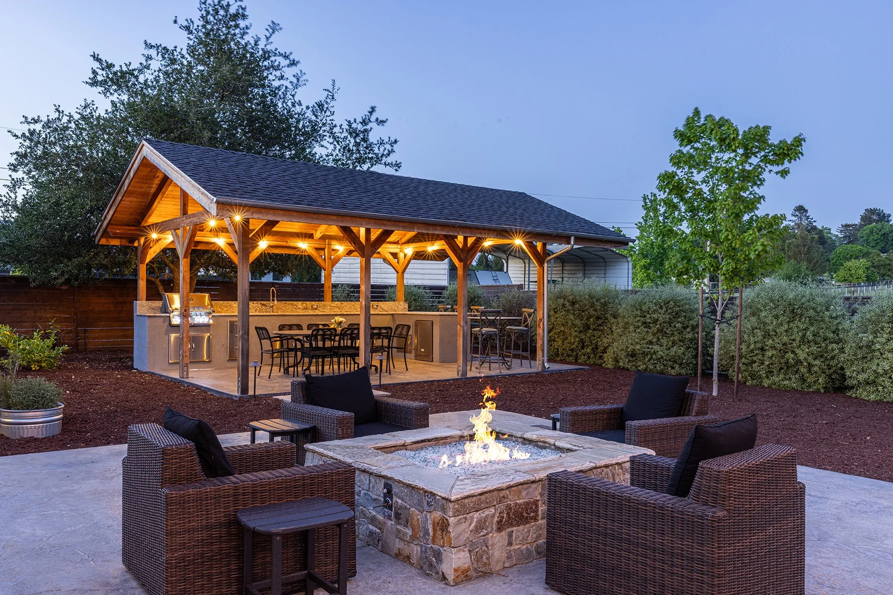 Outdoor patio with fire pit, wicker furniture, and a covered dining area with built-in grill and lights.