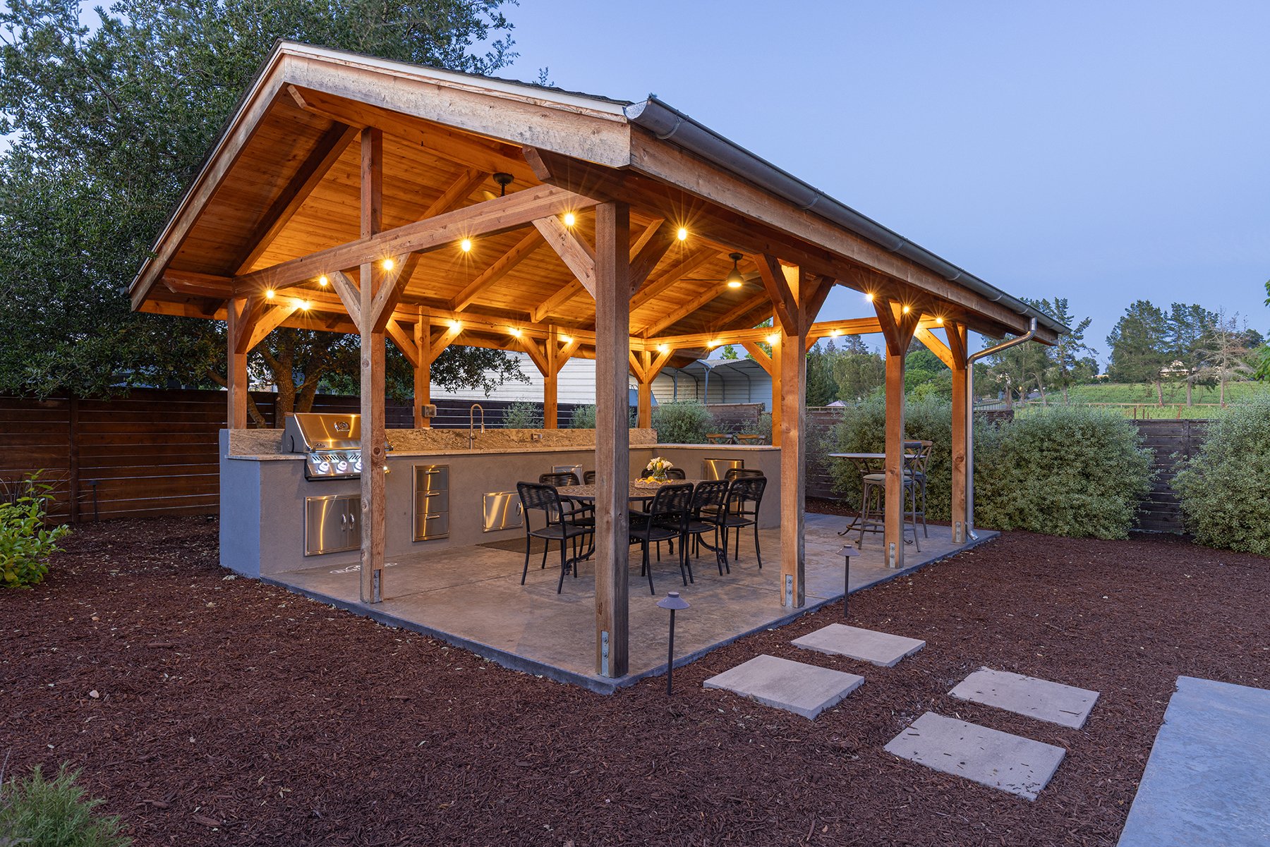 Outdoor kitchen with wooden gazebo, equipped with a grill, sink, and dining area, surrounded by landscaped garden.