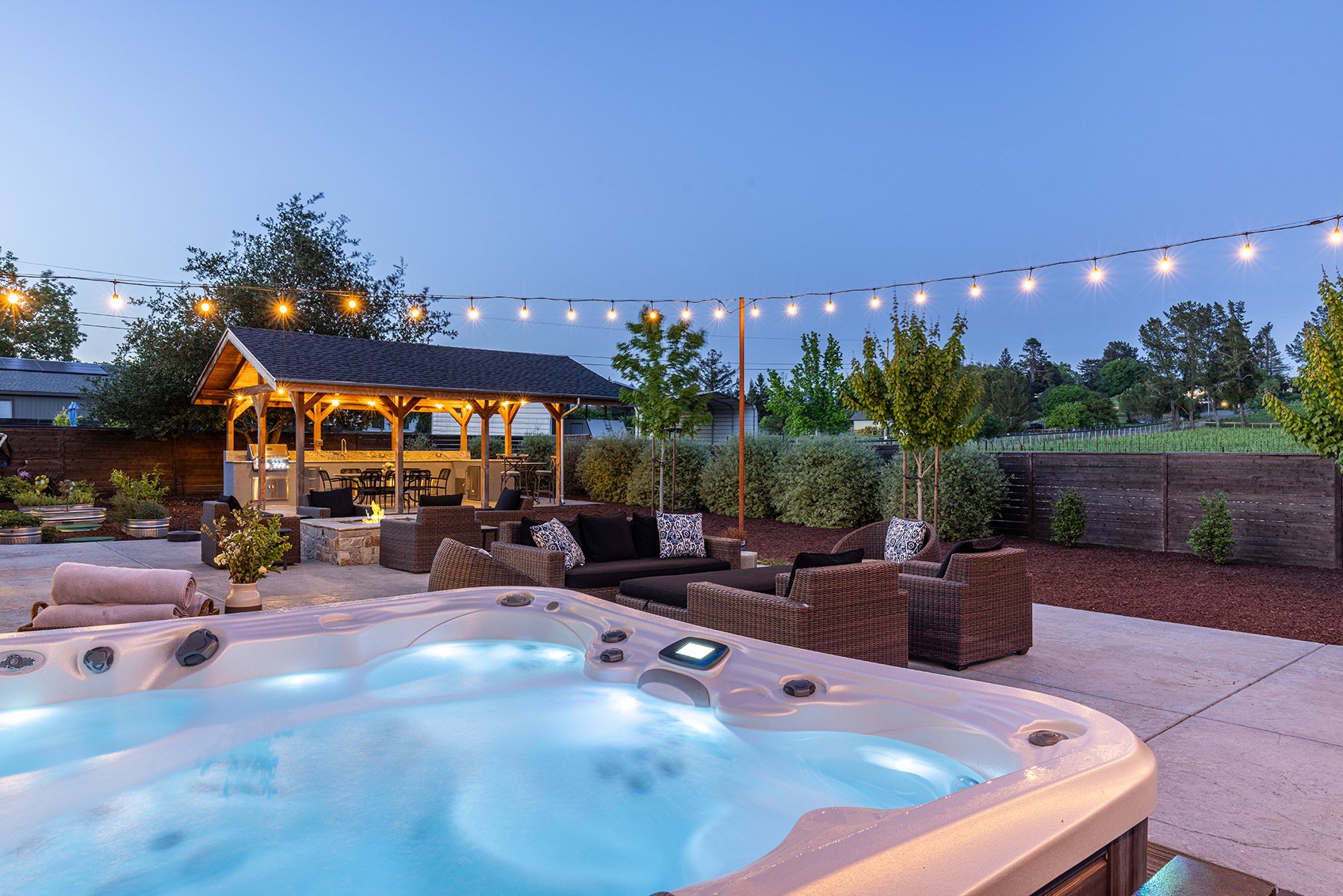 Backyard with hot tub, patio furniture, gazebo, and string lights at dusk.