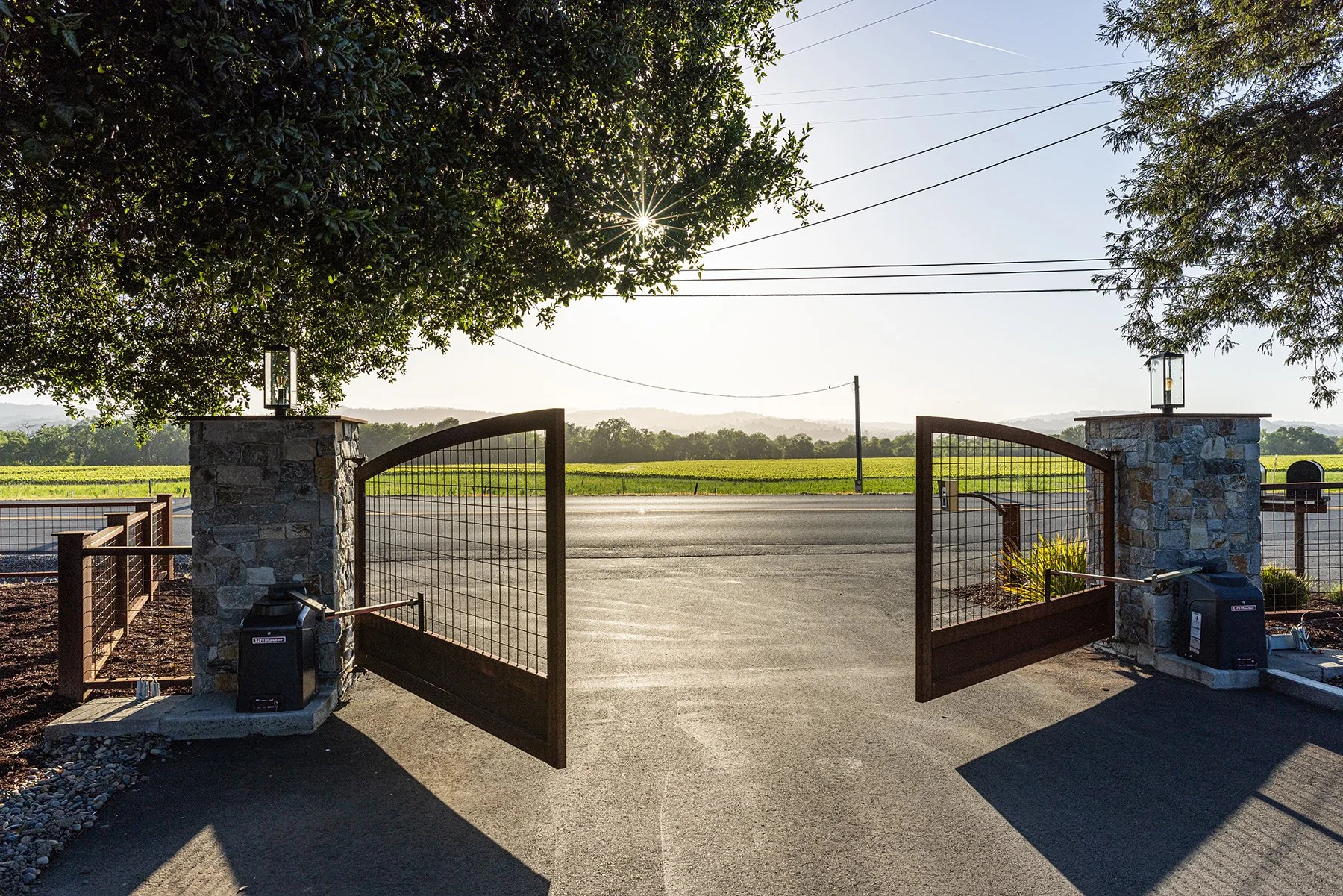 Open wrought iron gate with stone pillars leading to a rural road and field, with trees and sunlight in the background.
